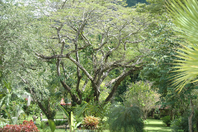 The gardens. Pair of Scarlet Macaws in the garden canopy.