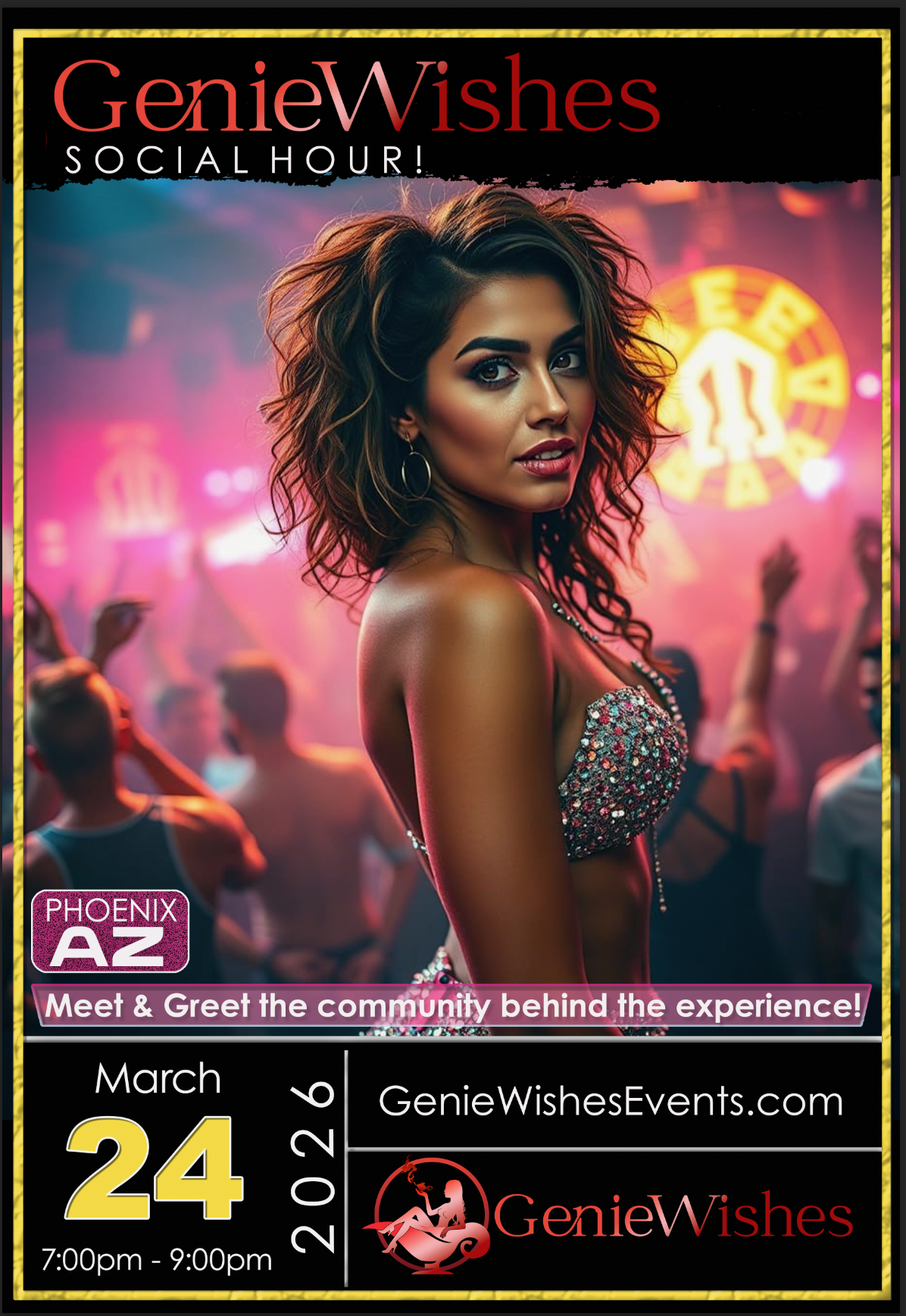 GenieWishes EXCLUSIVE Social Hour! είναι ένα σπιτικό φεστιβάλ εκδήλωση διοργανώνεται από Genie Wishes Events on in Phoenix, AZ. Το συγκρότημα αυτό είναι ανοιχτό για ενήλικες 18 ετών και άνω. Επαφή Genie Wishes Events για τα δευτερογενή πληροφορίες.
