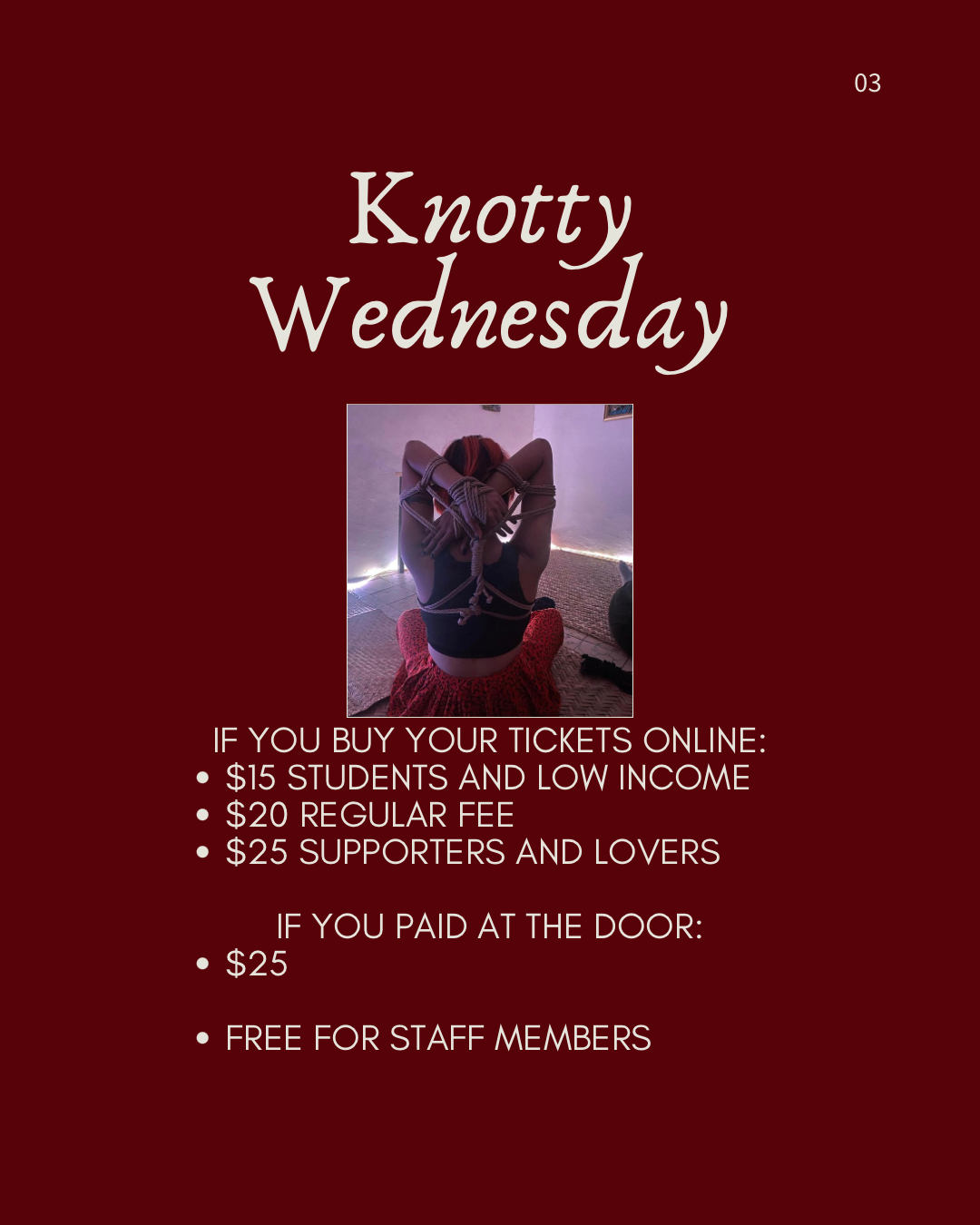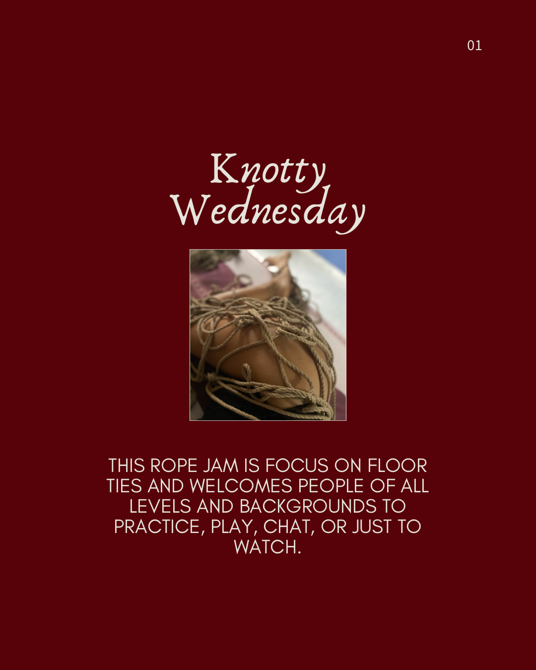 She is eager to welcome you to Knotty Wednesdays and create a space where you can explore ropes, intimacy, creativity, vulnerability, and more.