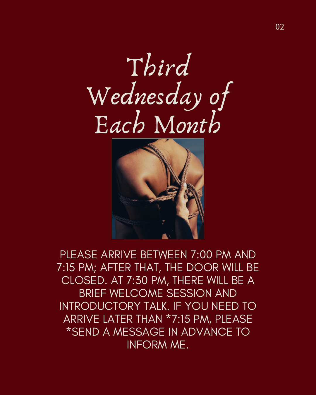 This Rope Jam is focus on floor ties and welcomes people of all levels and backgrounds to practice, play, chat, or just to watch. Please arrive between 7:00 PM and 7:20 PM; after that, the door will be closed. At 7:30 PM, there will be a brief welcome session and introductory talk. If you need to arrive later than 7:20PM, please send a message in advance to inform us. Hot tea will be provided.