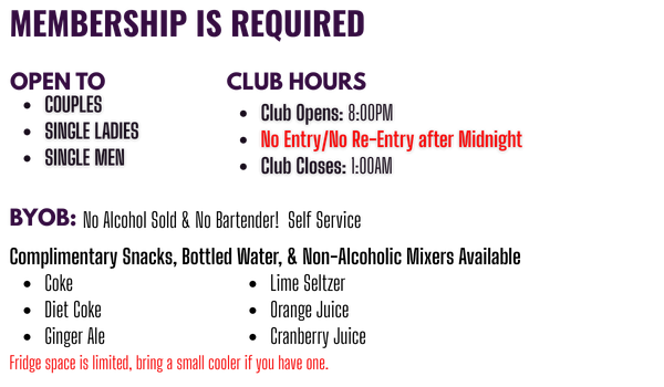 DRESS CODE:Gentlemen:Upscale Club attire, please! At least a shirt with a collar. Nice pants or Jeans with no rips or tears. Sneakers are ok but dress shoes look better.No shorts. No t-shirts. No wife-beaters. No sandals. No ripped or torn clothing. No sports attire. No baseball caps. If you show up in inappropriate attire and refuse to conform you will not be admitted and your donation willnot be refunded. Dress nice and be clean! Shower before the party and do not wear too much cologne/perfume. Ladies:We love creating fun, flirty themes for the ladies to play with each event. While creativity is encouraged, ripped or torn clothing isnt permitted. We definitely recommend leaning into the themeit makes the night more fun and its usually easier than you think. Feel free to bring a few outfit options and take advantage of the locker room to change things up throughout the night. After all, sometimes the best part of the night is the outfit change. CLUB RULES:Read THE CLUBRULESWicked Funis the#1 Swingers Destination in Connecticut. Tell your friends to meet you at Wicked Fun or come out and meet new ones. Call for membership information(860) 467-0470. NOTE: Wicked Fun is a private, members-only club, dedicated to preserving the privacy of all members. Were committed to being respectful neighbors and minimizing any disturbances around the club property. To help us maintain this standard, we kindly ask that noise be kept to a minimum, especially in the parking area. If you need to step outside to smoke, please use the designated receptacle just outside the door for proper disposal. As a private club, please donotshare the club's address with anyone. If youd like to refer someone, direct them to our website atwww.wickedfunclub.com. Only members are permitted entry, and non-members who arrive without prior arrangements will be turnedaway. Thank you for helping us maintain a respectful and discreet environment for all members. *If cash prizes are advertised for this event, they will be awarded only if attendance exceeds a minimum of 30 guests. | |